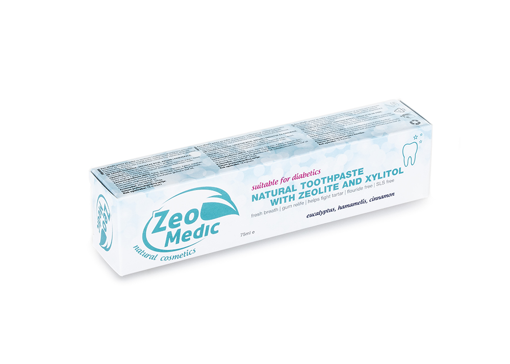 ZEO-MEDIC tandpasta is een volkomen natuurlijke tandpasta. De tandpasta bevat hoge kwaliteit zeolieten en natuurlijke etherische oliën. Het bevat geen kunstmatige kleuren en smaken, is fluoridevrij en bevat geen koolzuurhoudend water. Verder bevat de tandpasta ook niks van dierlijke oorsprong. De tandpasta bevat zeoliet, xylitol, etherische oliën van hamamelis (toverhazelaar) en essentiële olie van eucalyptus en kaneel. De pasta is geschikt voor diabetici, aangezien de tandpasta geen andere zoetstoffen bevat dan xylitol.